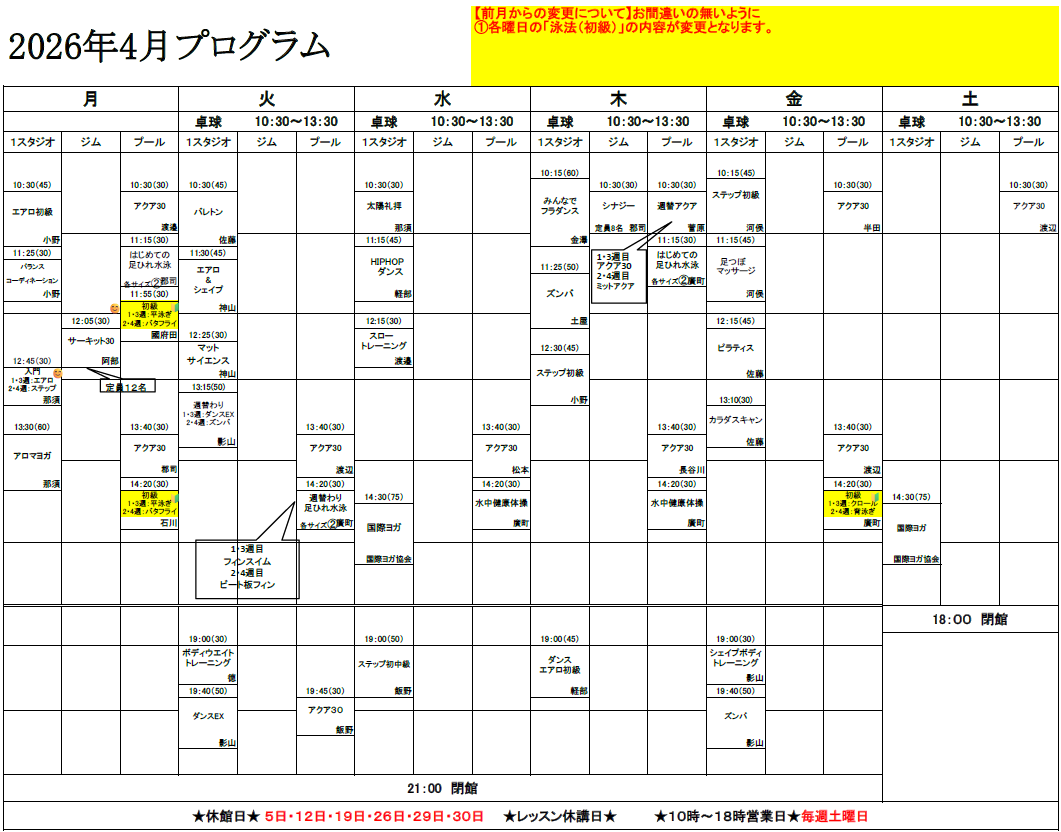 フィットネス・スイミング・テニス・学童など、すべてのコースで体験が可能です。